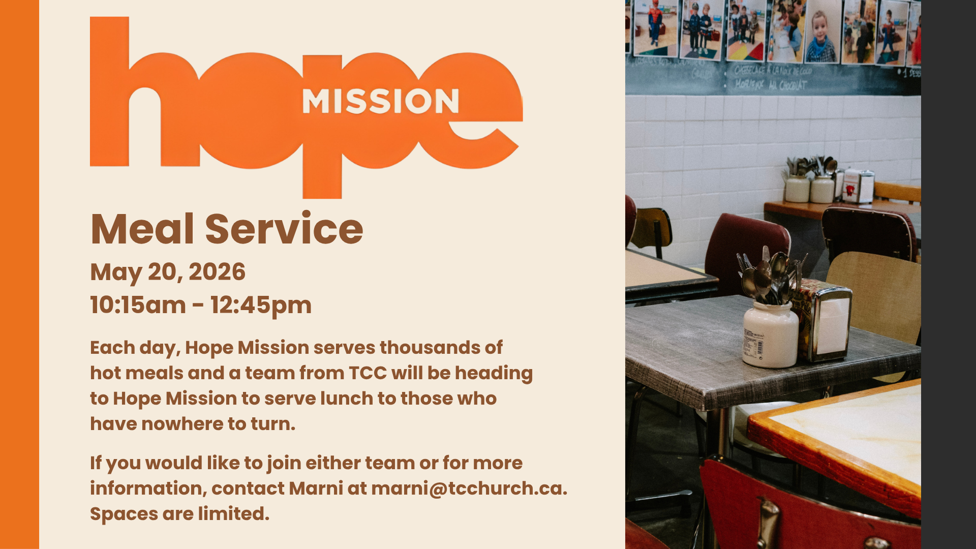 If you would like to join this team or for more information, contact Marni at marni@tcchurch.ca. Spaces are limited. Open to those 16 years of age or older.